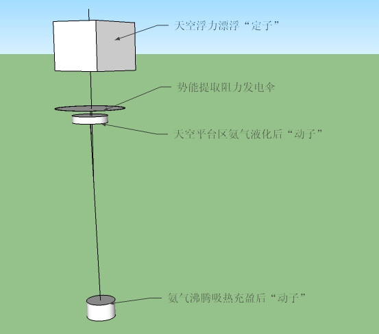 如上圖所示:設計一種系統,在地面的時候“動子”里面的物質呈氣態,而且單位體積明顯輕于空氣,就會形成比較大的浮力,使“動子”具有上升的趨勢,放開“動子”任其在浮力下,自由上升,當上升到一定高度后,“動子”內的氣體由于溫度明顯下降而液化成液體,這時浮力消失,“動子”在重力作用下會快速下落。這就形成了一個利用熱能、勢能、動能之間相互轉化而形成的一個“永動系統”而且能從外界獲取可觀能源來發電。只要做出“動子”上升時保溫,上升到一定高度后能自由撤銷保溫狀態進行熱交換就可以了。