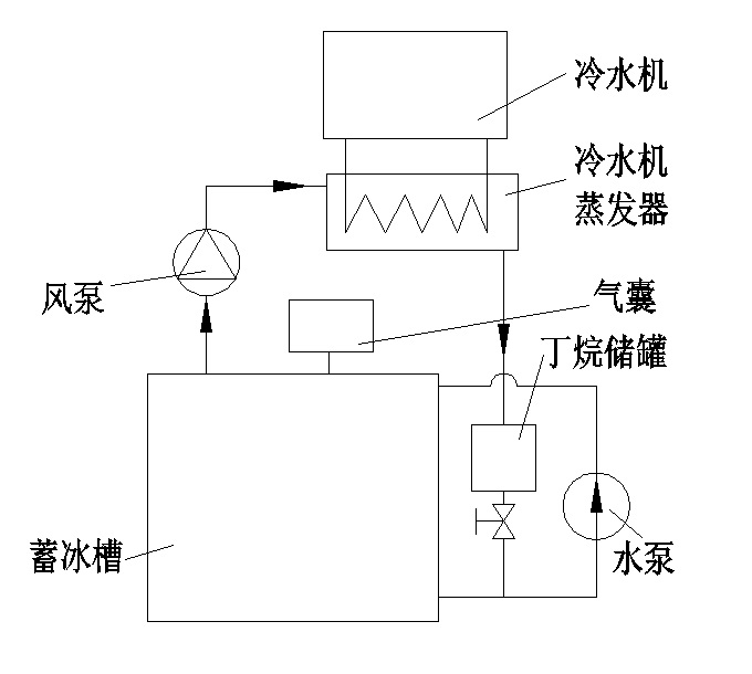 丁烷冰漿采用了簡單高效的理念,采用冷水機組、風泵、水泵等通用高效設備,流程簡單,控制容易,維護方便,氣態丁烷通過風泵加壓進入冷水機蒸發器,通過氣液相變高效換熱冷凝,液態丁烷和水一起進入水泵,再與水直接接觸再蒸發為氣態進行高效熱交換,水放出相變熱變為冰激凌式冰,可以泵送,冰漿流入蓄冰槽,氣態丁烷進入風泵不斷循環;氣囊接通循環系統,使系統既封閉又自動保持常壓(大氣壓力);冷水機蒸發器中丁烷溫度控制在20C左右(風壓約10kpa);蓄冰槽中氣態丁烷蒸發溫度在-0.50C左右(氣壓約0kpa),蓄冰槽中冰水混合溫度在00C。丁烷冰漿技術綜合能效比可達4.0,尤其投資省,可低于常規冷水機組空調投資,而且省電費更多可達40-70%。丁烷冰漿缺點是丁烷易燃易爆,有安全性要求,由于是密閉系統、充填量小(僅約30g/kw)、強制通風且系統壓力低(僅0-10kpa),丁烷不易泄露,采用安全防范措施,嚴格按安全規程操作,丁烷冰漿明顯比氨制冷系統風險小,也比燃氣熱水器/廚房煤氣風險低。
