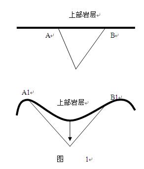 冰輒理論認為:地殼運動與巖漿無關,它是地殼自身結(jié)構(gòu)關系的進一步調(diào)整,是地殼自身重力作用的結(jié)果。至于山脈的形成,我認為同樣與地下斷裂密切相關,地下斷裂是地質(zhì)活動的結(jié)果,地下斷裂的的擴大與發(fā)展更是地質(zhì)活動的基本運動形式。隨著地下斷裂的擴大與發(fā)展,底層斷裂區(qū)域承壓能力逐漸降低,上部巖層也因地下斷裂的擴大,最終發(fā)生自身重力作用下的區(qū)域性沉降。如圖1所示AB、A1B1為斷裂上部的巖層,初始階段斷裂較小上部巖層AB無彎曲,隨著時間的推移斷裂逐漸增大斷裂上部巖層在重力作用下逐漸發(fā)生彎曲(如A1B1所示),這時,區(qū)域性沉降的上部巖層的兩端A1、B1處相對隆起,產(chǎn)生褶皺,這就形成了山脈。